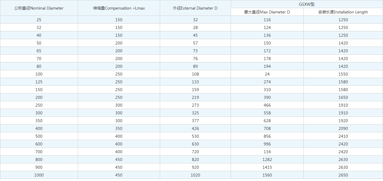 | 公稱直徑Nominal Diameter | 伸縮量Compensation △Lmax | 外徑External Diameter D | GSXW型 | |