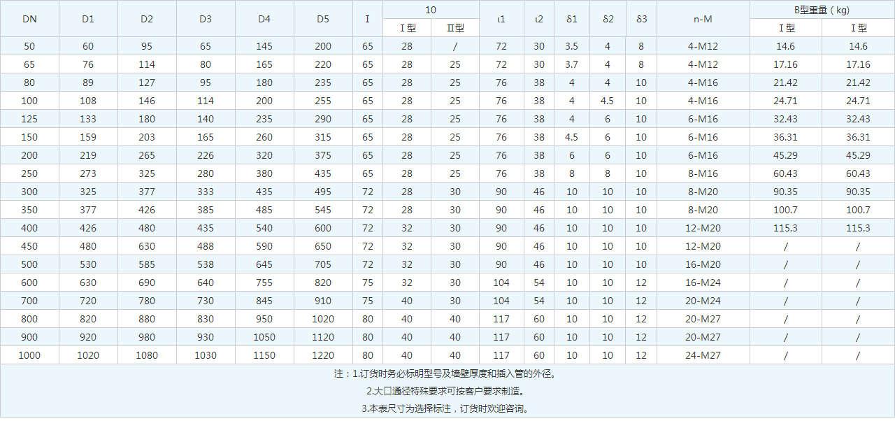 | DN | D1 | D2 | D3 | D4 | D5 | Ⅰ | 10 | ι1 | ι2 | δ1 | δ2 | δ3 | n-M | B型重量(kg) | |||